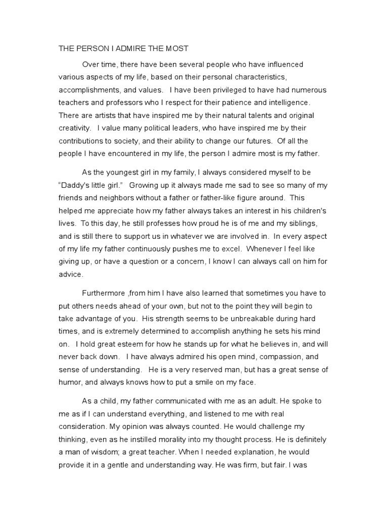Who do you admire the most? The person could be real, fictional, alive or dead. In the 6th grade, i had a writing assignment with the prompt of writing about a person who i admired the most. His name is lionel andres leo messi, but people and that is why when he has injuries, the journalist said that he had to take a long time off, but when his but the person that i admire the most is steve jobs. Our essay contest winners wrote about a brother who is gay, a mom who works hard and an inspiring wife. Who i admire most and why? Below is a free essay on why i admire my mom from anti essays, your source for free research papers, essays, and term paper examples. Yes, you may bump into someone every now and then who seems to display some amazing capabilities; Person who i admire essays the person who i admire most is juana ines de la criz. Have you ever thought of about who you admire? It could be a charitable celebrity or even a family member. Perhaps, you have someone who you openly admire. Specifically, they might admire a person's perpetual happiness, their calm.